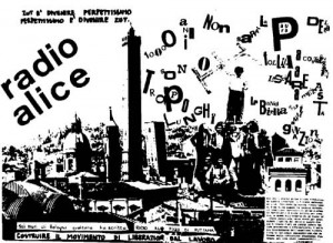 作为怪异新奇理论生产二人组的另一位,加塔利和流行音乐发生关系的方式似乎更为直接和激进,他将大部分公共生活投注到法国及国外的激进群众运动中,我们知道战后西方的群众运动和流行音乐的关系总是纠结在一起,如68年5月的法国学生运动其背景音就是英美及当地的摇滚乐之声。同样,与加塔利直接相关的1977意大利左派运动也是如此,无广播执照的“海盗”电台——如位于博洛尼亚的爱丽丝电台(Radio Alice)——成了鼓吹左派思潮和文工宣传的重要阵地。与加塔利有密切合作关系的爱丽丝电台主要播放:音乐(摇滚乐,爵士乐,某些古典音乐,民歌及政治抗议歌曲)、新闻(报道意大利及国外左翼和工人运动,当地学生运动,朗读左派“额外议会”报纸的一些内容,对女权主义者、同性恋者和激进民权组织的活动做跟进报道),再加上对广泛到鸡零狗碎的话题——任何人可以通过电话或直接到电台总部告诉我们你关心什么——之评论。看上去,爱丽丝电台的确抢占了(激进左翼)舆论宣传制高点;不光如此,空间上爱丽丝电台也站在了高处,电台总部(其实也只有总部,没有分支机构)设在博洛尼亚区某栋破旧公寓顶层。