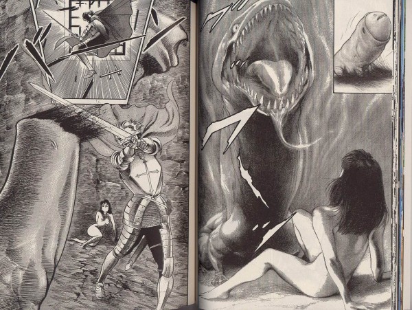 女孩高声呼救,这时从天窗只身飞下一名英俊骑士,一剑砍去阴茎兽头,