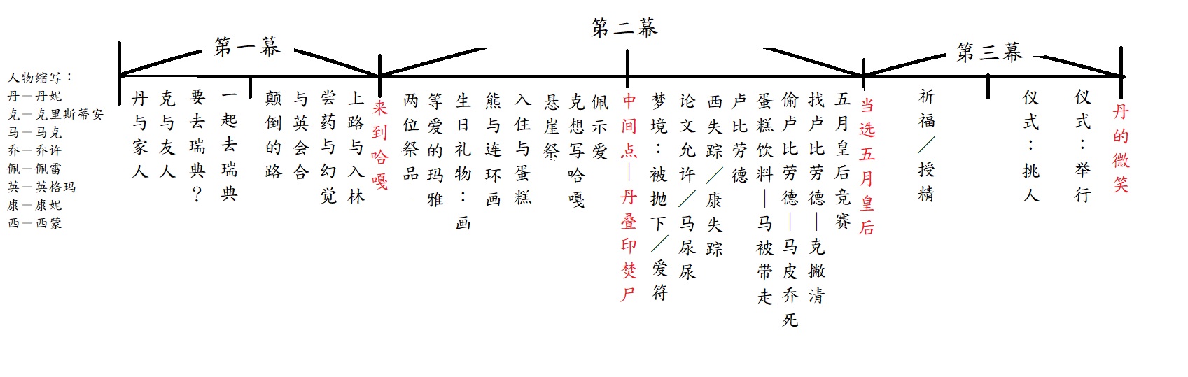 当丹妮、男友克里斯蒂安与友人来到瑞典乡间的哈嘎镇,看了看表,约36分钟处,心想,按全长147分钟(扣掉片尾rollcard约5分钟,正片约142分钟)来看,似乎恰在四分之一,难道这部片是传统的三幕剧结构吗?