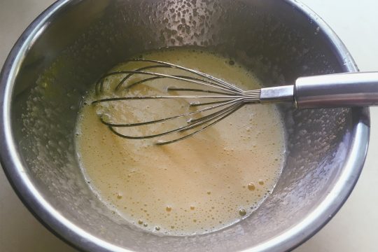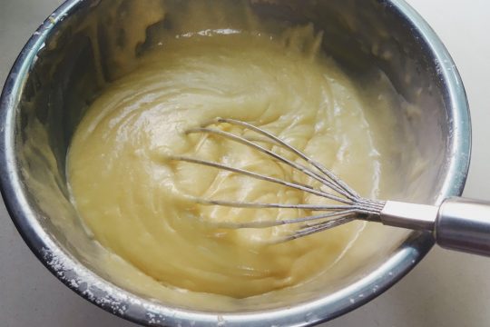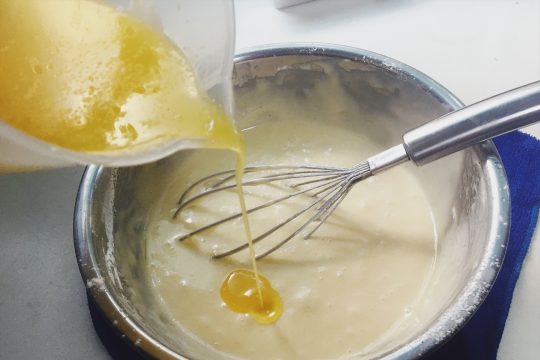 4、用隔水加热或微波炉低火把黄油融化,冷却室温,少量多次倒入面糊拌匀。黄油融化后会在容器底部形成白色沉淀物。尽量不要让沉淀物进入面糊,否则蛋糕口感会略粗糙。
