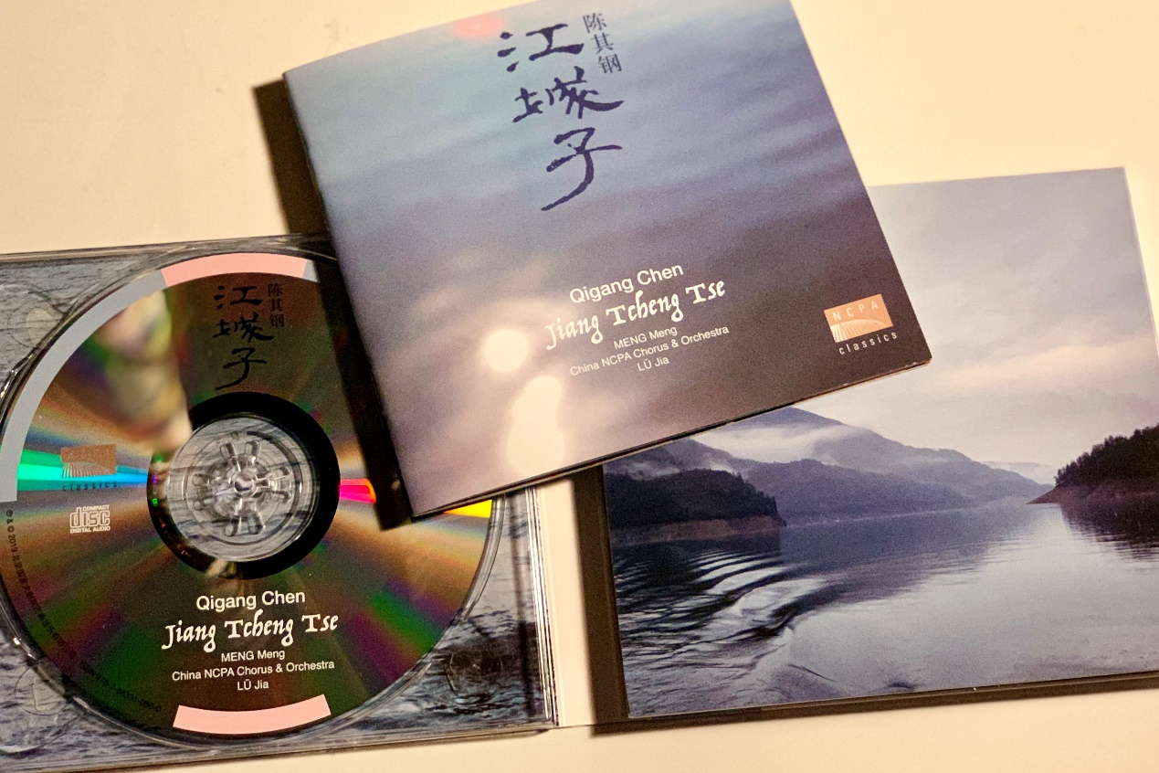 中场时候去买了张NCPA出的《江城子》,就收录了这一部作品(怎么现在都爱出单曲碟?)- 还包括了DVD以及陈对这支作品的几段实验录音。封面、封底以及唱片小册子都运用了灰蓝主色 – 阴郁湖蓝色。而封面上有一缕柔粉色光晕,同样在唱片上点缀了两条粉色去呼应,精彩。小册子纸质精良,页内字体细而清晰(我喜欢小字体的书和册)。其中有由陈其钢自写的作品背景,乐评人焦元溥的作曲家和作品介绍,以及乐团和表演者的简介(中英文双语),可谓业界良心。