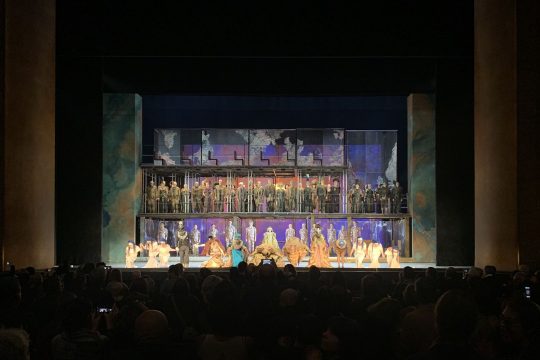 再说到Met这版的另外一个显而易见的亮点:杂耍! 从第一幕开始,就有一群身穿紧身衣的杂耍者,独自或互相抛接白色小球,第二幕是棍棒,第三幕又回到白色球,只是体积更大。把古埃及法老题材的歌剧和球球杂耍相配,的确大胆,而节目弹伤却有理有据地提到某种神奇的巧合:在 Beni Hasan墓葬群里的一幅壁画上描绘了三位杂耍抛掷球球的女子,这是有史以来第一幅记录杂耍的图像!而真正的编舞灵感应该是来自格拉斯的那一遍又一遍貌似重复但时而变化组合的乐句和节奏,正如球球在杂耍者手中不停地上下翻滚,时高时低,时急时缓。同时,从舞美来看,白色杂耍球是和谐与耀眼的太阳,却反差于舞台上第一幕和第三幕的方形构架。这些令人眼花缭乱的杂耍幸好是用了白色的物体,并没有重叠与第一第三幕中服饰的华美,对整体听觉也并无累赘感 – 毕竟五官都是联动的,大脑注意力却有限。