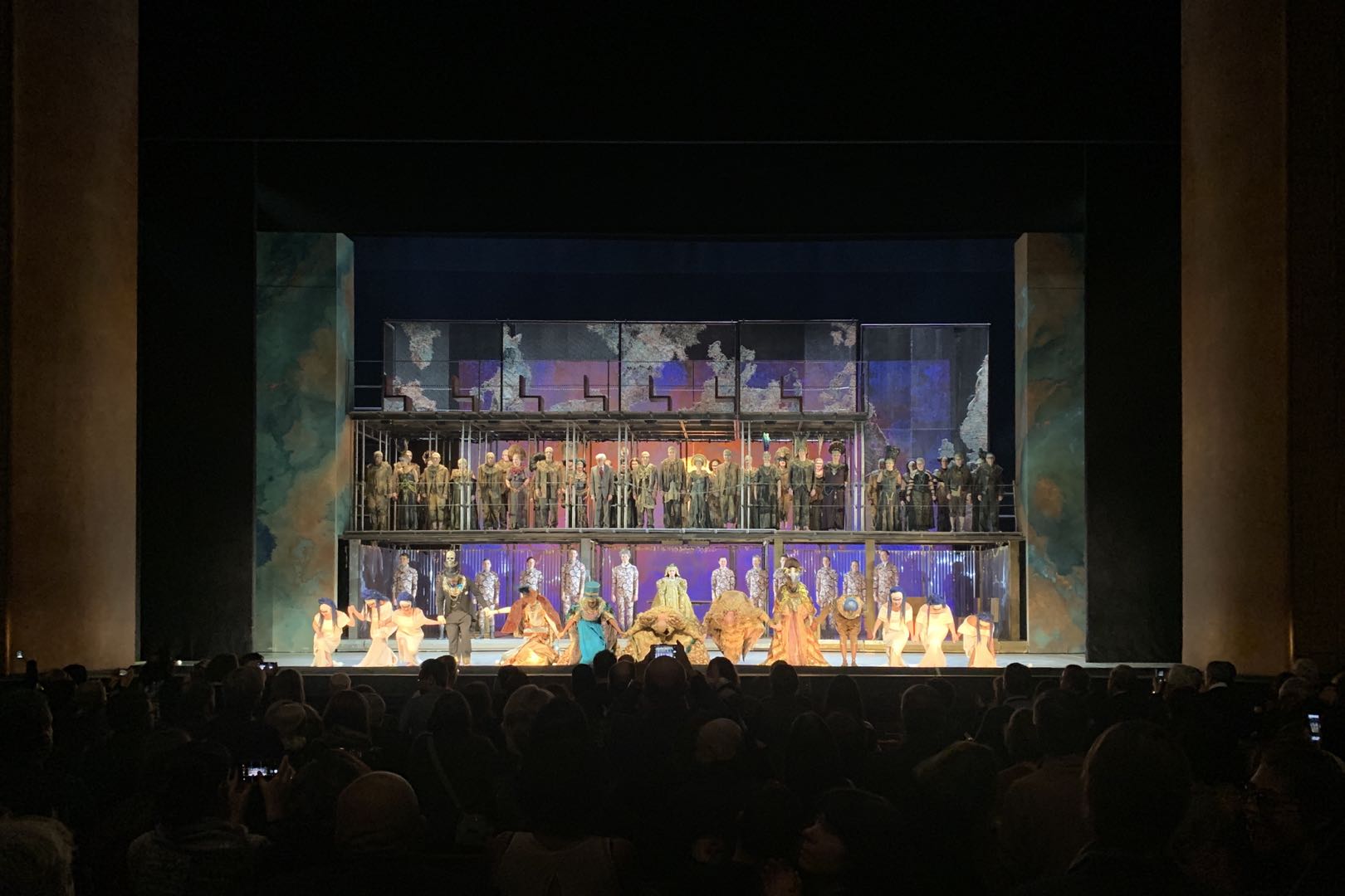 而真正的祭祀却是穿着欧洲古着的那位。燕尾服、高礼帽、礼帽上还镶着一个骷髅头。这样的穿越在这版剧中还有很多,无论是服装或是情节。第一幕第一场中的;而后出现的Queen Tye是一身维多利亚时期宫廷,头上羽毛顶着一面镜子;General Horemhab打扮好似非洲某国独裁者;而最后一幕更是出现了身着猎装或白大褂们的的。这样设定符合剧情转变,也承托了格拉斯混合着现代特征不断重复的乐句和时而变换的节奏。当然也可以想得远一点。这样的古代-现代设定,映射了那个即使在现代也不变的话题 – 磨灭与发掘、统治与变革、多神论与一神论?似乎第一幕和最后一幕的舞台构建 – 铁管脚手架也在暗示着同样的主题。第一幕和最后一幕的舞台构建都是为三层,而第二幕却不是,是否代表着三段历史中只有第二段是一神,且社会框架也不同于第一和第三段历史?
