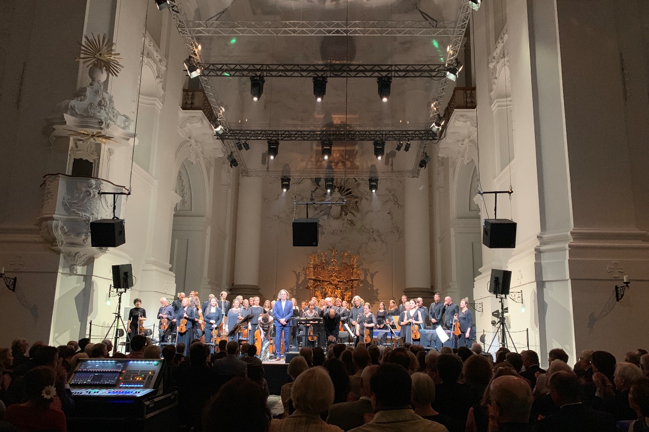 28日晚Dusapin的Medeamaterial和29日晚Xenakis的Kraanerg都在萨尔茨堡大学教堂里演出。一座巴洛克式样的建筑,白色的墙面,立柱,穹顶,祭坛上方的圣母像也是白色,背后点缀着金色的圣光,而七十一个小天使飞翔在圣母四周。1709年建成的教堂却上演了两部现代作品。