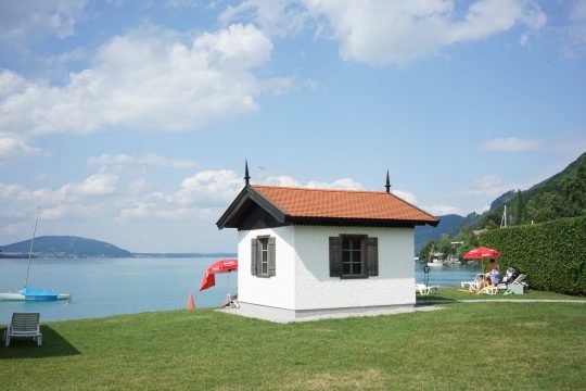 房子的整体,标准得好像强手棋里的地产棋子,或者小朋友常画的那种山野间的房子 – 斜坡顶,四方墙体,三面窗户,一面门。只是小朋友不会在屋顶上加两个铁尖顶。从帐篷堆望去,白色的墙体未有任何污迹,好似长期有人打理,而背后的湖水湛蓝,屋子背后还露出了两张白色的沙滩椅,以及一顶红色的可口可乐广告伞。