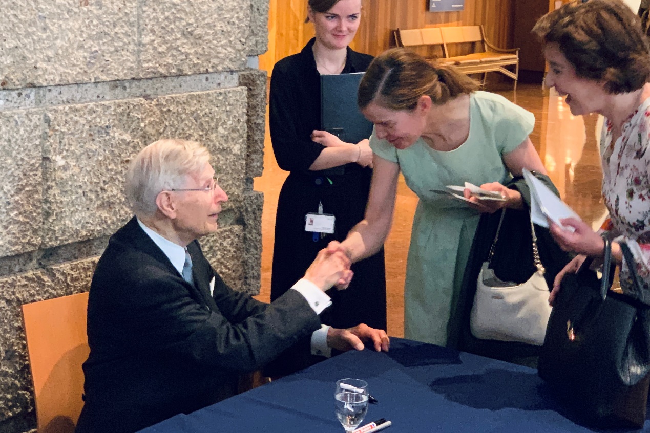 演出结束后,我和家人在大厅外看到等待Steve Smith的签名队伍已经排成了长方形的长宽两条边。而我们站在了签名桌不远处瞄着,想从近处看下这位能把鼓打得好似人间奇迹的老爷子的真容。没过多久,老爷子就走到了签名桌前坐下,他的VI NYC的朋友们没来,还是穿着演出台上的那件蓝色花衬衫,挂着金链子,光溜溜的头顶上还有汗珠,面色绯红。每位观众递上来的唱片,他的书Pathway Motions,甚至是T-shirt,老爷子都极其认真地签了,沉着而面带微笑,根本看不出几分钟前刚刚酣畅淋漓地打完了一整场。