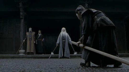 徐:時間。我三部電影的拍攝時間,《倭寇》拍42天,《箭士柳白猿》拍63天,《師父》拍93天。每一個電影多出來的時間,第二個比第一個多20天,第三個比第二個多30天,多這30天幾乎都是用來拍打戲。拍《倭寇》最後一場決戰的戲,下午進場景,當時通知我,明天上午天亮之前必須拍完,所以你一定要想一個簡潔的方法,不能糾纏武打,等於在現場演員之間沒有切磋的時間,得玩一個大的、會對觀眾有刺激的電影概念。《師父》多要了一個月的時間,除了完成大的概念之外,還能完成技術工作的細節,演員可以在現場切磋、對練。另外,這次請的演員都是心狠手辣的,像蔣雯麗、金士傑老師、廖凡、黃覺,都能對對方下點狠手。(笑)