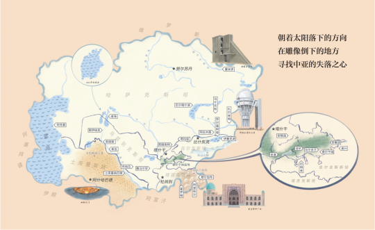正因为旅行者“外来”的目光,他/她往往会天然地联结所行过的路。“外国人”身在异乡,有意无意之间,难免留意起与自己的来处有关的景象。置身于与中国毗连的中亚,看到接替“列宁大道”的“邓小平大道”,路遇在中国留学、假期返乡的女孩,听人说起中国投资的巴士和高速路……书中也有大量访古式的“探寻”,探寻玄奘记录过的佛塔,探寻大小和卓与清廷纷争的遗迹。去处和来处总有相连。在这里是切剖时间的层叠,读者仿佛也同时置身于多重时空。