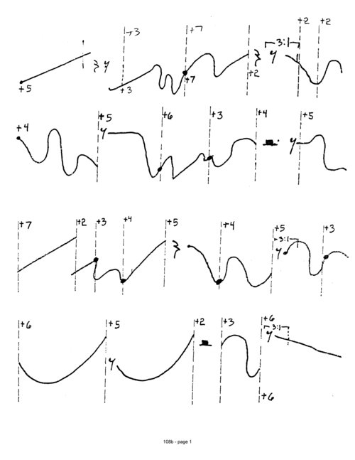 然而,这个独立的艺术综合体并未走向自我绝对化,即一种仅仅关注完善自身形式的封闭化发展。几十年来,它愈发臃肿的机体在扩容自身的同时,不断抖落出有待另行开掘的局部组织,它们逐步分化、衍生出新形式、新系统,并且同临近正谋求大力扩张即兴的系统取得了联系。作品173和175仅仅是浓缩了独白、合唱与舞美艺术的微型剧场,是更大规模歌剧现身前的序曲。作曲家还将人声功能单独引申出来,深刻发展了其在即兴表演当中的应用,通过将表音的字母排序组合以指示发音,反复调动歌手的嘴型,使之乐器化,这一规范化技术成功地把人声引入了GTM(注释13)。Syntactical Ghost Trance Music(语法GTM)作为分支系统直到今天依然发挥着人声训练的教学作用(注释14)。较为少见的Pine Top Aerial Music系统乃是带有训练意味的语法表演与舞美艺术的一体化。由此,Anthony Braxton中后期开发的音乐系统,都在一定程度上相关联,彼此影响,互为促动。