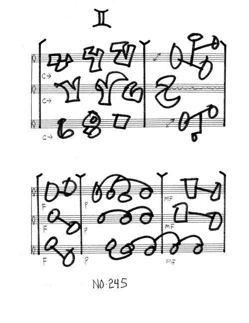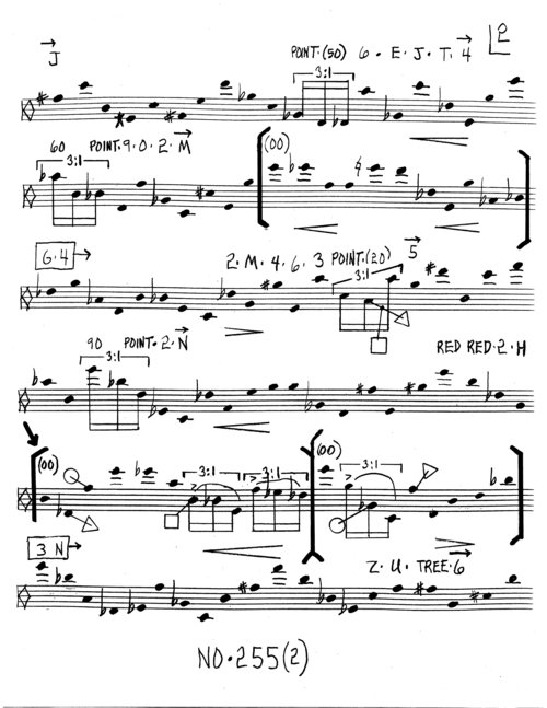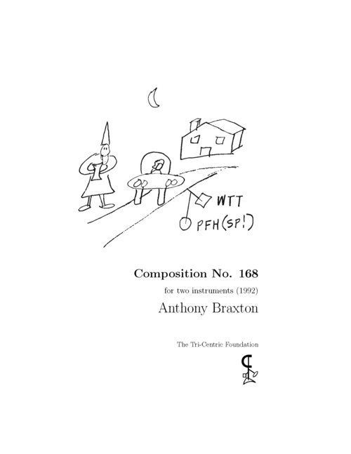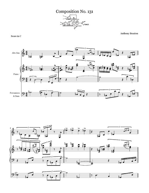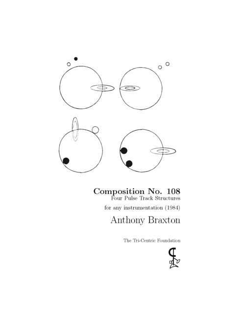 迄今,Anthony Braxton全部400多首作品的乐谱并未悉数对外公布。他的三中心基金会官网(注释1)上可免费查阅的数十首作品的若干页乐谱显示出如下情形:1)相较于和声与旋律的运算经营,他更乐于开发和丰富他专有的符号指令系统,前者有一套可公度的技术评测体系,后者则随实际应用人员与情境的更替表现出相当的动态随机感。2)作曲家的创新性并未以脱离常规乐理知识的面貌示人,作品的主体部分仍然有赖于五线谱上跃动不绝的音符构成,对身具一定乐理基础的人来说是可识别、可解读的,前提是要对这套特别的指令系统有所熟悉。3)作曲家笔走龙蛇,他的乐谱看上去就如同被奏出来一样鲜活,仿佛有一套游离于音乐之外的直观的视觉艺术方案,常常给人一种独立自足的美学错觉。4)随着技能的精进和系统的逐步完善,作曲家愈发不受传统既定模式和通行的处理流程的钳制,反客为主,大胆调用可资利用的全部技术手段,根据音乐发展的实际需要,肢解、跳接、叠合、重组五线谱上可见的任一资源,表现出非凡的主体能动性。5)图案、图形与符号、字母、数字的奇特组合取代文字为作曲家的全部曲目定名,这一生动的冠名法为充分显示每一单个作品的特殊性格提供了最优效能。标题兼具展示概念意涵和浓缩创作特技的双重功能,更进一步预示了每一首被作曲家注入了生命的作品所独具的自动生成与自我繁衍的属性。