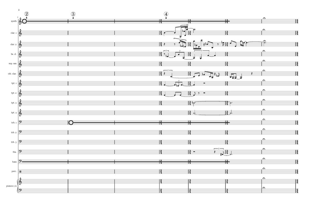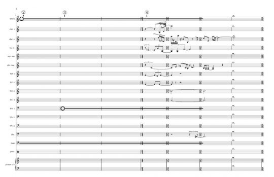 一旦逃脱初创者的法眼,音乐自行转为集体创造模式。在发生学意义上,GTM就表现为一众友好体验者从齐声高奏的主旋律中一一脱落,再统一,再脱落的反复脱嵌—嵌合现象。大部分时间,主旋律作为整个系统的联动中心持续存在,时而突显其带动作用,时而遭到拉伸、截取,隐于即刻处理的素材背后默默运转。在这里,不存在作曲材料与即兴演绎的截然划分,作曲家力图模糊掉这一存在于习惯话语中的二元论结构,将频繁隐现的主旋律应用为发动即兴演奏,诱发材料增生,助推乐曲演进的基础性载体。它不断闪现恰如其分的动机,长出即兴的叶脉,适时添加外部变量,生出系统内的藤蔓。音乐决非呈现为死板的流水线作业,诸生产步骤同步进行,由演奏员依指令引导并结合实际情境全权发展各自的创意以完成总体的产出。一个被规定了的即兴创作与预备素材加工处理相伴生、相纽结的复杂综结,贯穿于一条预设的主旋律当中,交错融合、统系于一,其莫测难定的形式动摇了以往人们据以认定即兴音乐的固有观念,向当代观众的听觉习惯发起了严峻挑战。