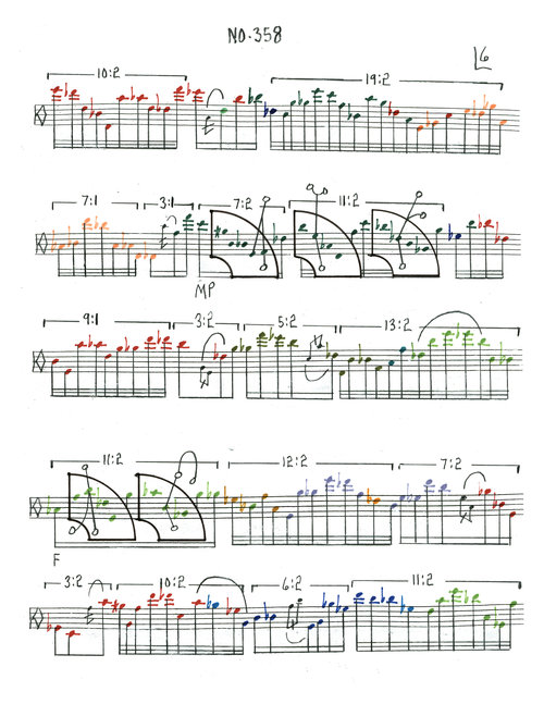 经过反复的打磨与巩固,发展到第四阶段的GTM已获致名目繁多的指令以极大地扩展其概念范畴,作为作曲家整全音乐系统中的一个派生系统,有意识地纳入诸前代系统与比邻系统中的关键要素并整合为一,使这一不断扩容的动态系统,转而呈现为一个非派生的人力造化。作曲家所以能构造他横贯东西、架通南北的信息交换网络,在于他前后一致的理论进路,这为他层层升级的音乐系统预备出良好的基础材料,从而规避了伴随每一次跃升的大拆大建工程,从最经济的手法中萃取出最高效的改造。稍后的落河音乐(Falling River Music)系统便将构成GTM作品躯干的主旋律置换成一幅硕大的抽象画,在增强音乐可视化的意义上,从旧材料中释放出新理念,据此亦可认为该新系统是其前代/比邻系统运作时的联动反应。