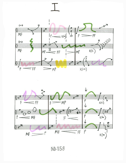 GTM看起来非常经济,反映在五线谱上,它只有一条仿若无始无终的旋律线,由一串四分音符的符头(略去了符干与符尾)绵延数十页而成的所谓“主旋律”,构成了作品唯一凸显的乐音脉动。参与其中的全部演奏员均须同时面对同一页内容,读取同一行音符,处理同一组技术要求(无需另抄分谱)。表面看似凡庸低能、枯燥无味的作品一旦步入实践,当即判若两人,历经十余载、四个阶段逐级开发的符号指令系统投入使用后,成倍激增了即时可选的素材范围。通过三种逻辑安排,对应引入语言音乐、次级素材和三级素材(注释2),大幅扩容了结构规模。不规则、非对称的节奏细分,尤其是后来透过颜色指令(注释3)指示的速度、力度、音高、音色的微弱变化,敦促个别演奏员随进度需要从主旋律的水平一维魔幻般地分化出垂直一维,即单声部旋律从自身派生出(非严格意义上的)对位声部,作品由此转为复调音乐。定期邀请演奏员离开眼下正在处理的乐谱页面,进入作曲家的其它作品(注释4),中断了驱策乐曲有力发展的主旋律流动,全曲切换至另一场景,那不啻为一门外科手术般精准切割作品,添加某种过渡乐段的手艺。在这里,直观视觉与感官听觉,静躺在乐谱上的抽象指令与动态多样的执行操作,简便易行的技术策略与枝繁叶茂的音乐细节,形成尖锐的对比。