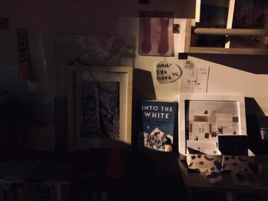 书店灯的开关在全屋最里面的储藏间,每晚钻进帘子内关掉一排,再转身凭感觉跨出一步步。小心踢到纸箱。街灯有一些亮光,最远辐射到门口的展示架上。落地玻璃门的门头悬挂的彩虹雨饰物拉长了影子,一点点水滴成了一线线雨柱。踏过滴落地板上的暗影,走出温暖的小屋之前,瞥见Into the White的光面书封反照着白光。斯考特极地探险的回响。重重反射已分不出这光的来源,春日的雪照亮了一切。