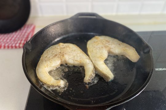 3、大火烧到锅子冒烟的程度,下鱼块煎到两面略带焦黄。鱼块受热会蜷缩,所以我把肚子部位剪开了。煎鱼需要较大的火力,橄榄油烟太大,所以这步我是用普通精制油煎的。煎好的鱼盛出待用。