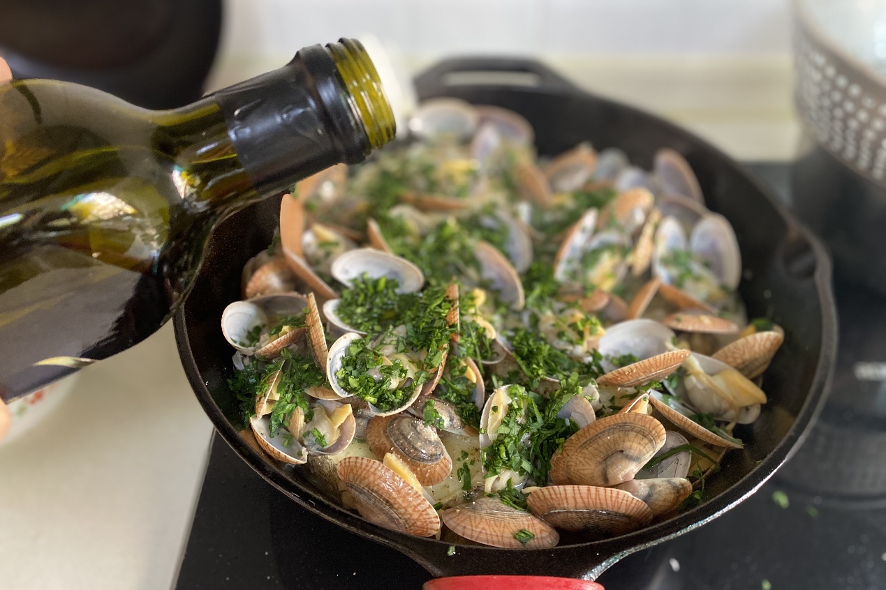 5、倒入半杯白葡萄酒,加入煎好的鱼和吐净泥沙的腰蛤,加少许黑胡椒,加盖中大火焖煮到蛤蜊全部开口。这里是不需要加水的,腰蛤会出很多水分,白葡萄酒里也有很多水。