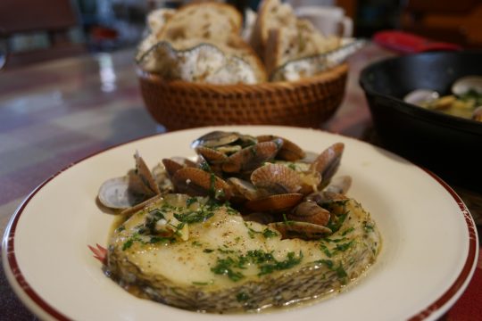 6、开锅,撒一把切得细细的欧芹,挤入大约半个柠檬的汁,再狠狠淋上一些橄榄油,最后汤汁要有油汪汪的感觉。尝一下咸淡,银鳕鱼事先撒过盐,腰蛤也自带咸味,看情况决定要不要再加一些盐。关火。