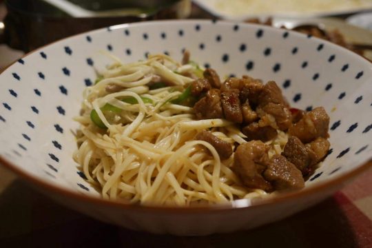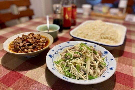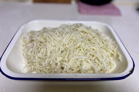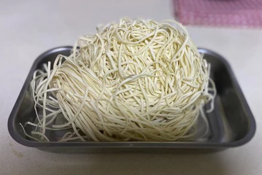 第一步要做的是蒸制。上海的市场上可以很容易买到冷面专用面条,它是提前蒸过的,摸起来比普通的鲜面条硬一些,如图。买不到也没有关系。可以用任何新鲜面条或者干挂面隔水蒸10分钟左右。蒸过的面条可能看起来和生的区别不大,但吃起来与没有蒸过的有云泥之别。蒸过的冷面根根利落,没有蒸过的却质地稀烂,千万不要小看这一步。