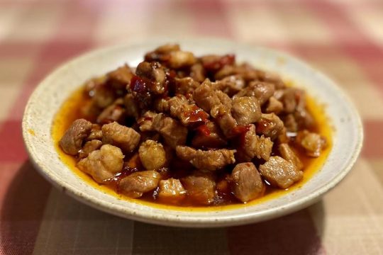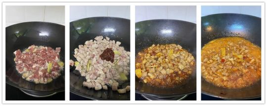 做辣肉我最喜欢梅花肉这一部位,带一定脂肪,肉质不干柴,其他部位的瘦肉比如里脊肉也可以。肉切小丁,不需要腌制。锅烧热,倒入比炒菜多一些的油,油热后倒入肉丁和少许白胡椒粉翻炒,变色后加郫县豆瓣炒出红油,根据咸淡加一些生抽,加一些白糖,如果觉得颜色淡就加几滴老抽(我没加)。加少许水咕嘟五分钟左右至水分基本收干,表面浮有红油即可调整一下盐味关火。如果觉得颜色不够红可以另外加一些辣椒油。最后的成品应该是油汪汪的,不宜太清淡。我也尝试过加一些葱蒜,但是发现味道不是那么正,似乎不加葱蒜的话更接近传统的口味。