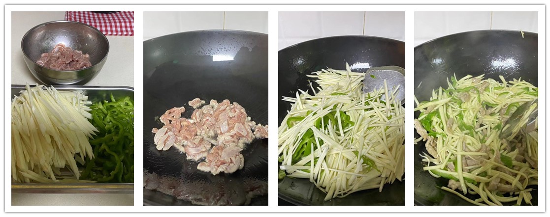 三丝原料:里脊肉、茭白、青椒、白胡椒粉、淀粉、盐、味精、植物油。