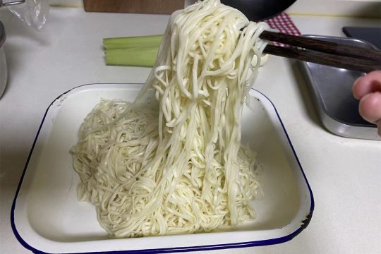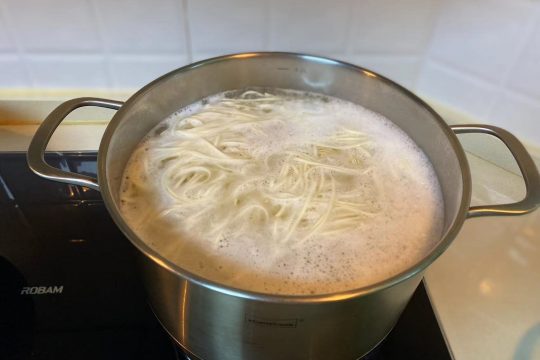接下来是水煮。烧开一锅水,水量要足以让面条自由翻滚。投入蒸过的面条,像煮普通面条一样煮到软硬适中。