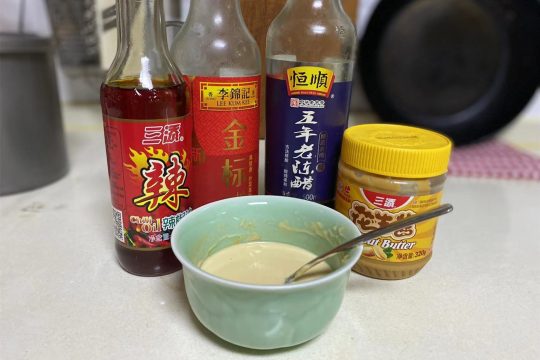 上海冷面的调料一般由花生酱、酱油(家里制作可用生抽)、醋、辣油组成,其中辣油不喜欢可以不加。其他调料一般不加,绝对不会有蒜泥、葱花之类的。各种调料不用事先混合好,放在桌上随个人喜好自己添加。市售冷面也是现场一一加入各种调料的。注意一定是花生酱,不是芝麻酱,也不是花生酱和芝麻酱的混合物。可以是原味花生酱,也可以是四季宝那样调过味的,上桌前用水稀释开,尽量稀一点,否则拌不开且很腻人。印象里小时候上海的辣油都是红红的纯油,没有辣椒碎,长大后很少吃了,这次为了写菜谱还特意去网上找了一瓶差不多的。