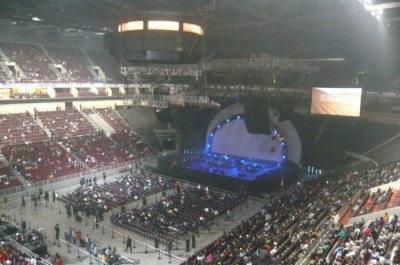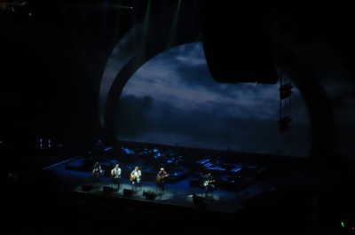 19:40,舞台上追光灯亮起,清澈的吉他声伴随着悠扬而熟悉的嗓音,四只“老鹰”稳稳地坐在椅子上。开场三首歌都是Long road out of eden里的歌曲,引起的反响不大。第四首歌温馨的前奏响起,人群开始兴奋,跟着哼起“Love Will Keep Us Alive”。
