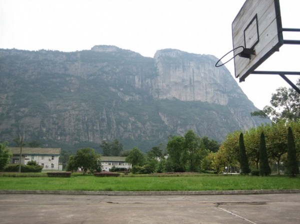 对于这个发现,我不知道是否应该恭喜,因为我对面上铺的兄弟就是当地人,对于当地的河流山形应该比较熟悉。当然,作为某基地的技术军官,他大部分时间在山洞里搞科研,不见天日的时候居多。但我还是要感谢他告诉我这个消息,因为我也曾经在该基地搞过科研,虽然如今记得的只是一面叫“鹰嘴崖”的绝壁(下图,前景是我兄弟小学篮球场)和基地食堂里腻死人的粉蒸肉。
