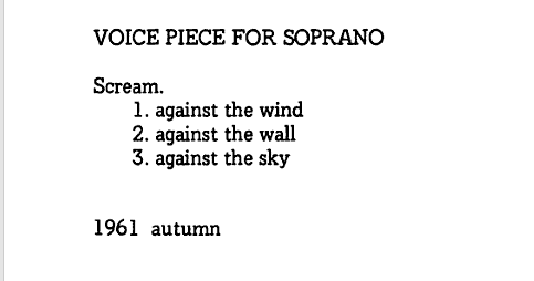 “Event Scores, involve simple actions, ideas, and objects from everyday life recontexualized as performance. Event Scores are texts that can be seen as proposal pieces or instructions for actions. The idea of the score suggests musicality. Like a musical score, Event Scores can be realized by artists other than the original creator and are open to variation and interpretation.”