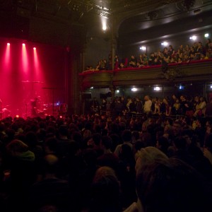 第一次去位于Limehouse的场地Troxy,尽管我在大二的时候在这里住过一年。比邻各色背景的劳动人民居住的East End,靠着东伦敦的港埠,这个上世纪初很多中国水手集结的地方,我们可以从经常出现的以‘传道’为名的楼房体会到他艰辛沧桑的历史感,虽然现在沾着不远处的经济中心Canary Wharf和West India Quay新起的高级公寓的光,Limehouse还是没有摆脱那几分暗里做事见不得人的感觉。Troxy这个20年代的art-deco风格的前电影院,加上内部带着80年代俗艳色彩的装饰,或更适于做一个东伦敦黑帮控制下的舞厅,却成为了一个不错的有点突兀的摇滚场所。比Koko干净,比 Sheperd’s Bush Academy音响要好,非常高的天花,比较大的舞台,不会让人有憋闷的感觉。虽然MoF各成员自己的乐队都拥有不少拥扈,意外的是他们第一场英国的演出观众不过7分满,站在前面也不是很拥挤,令到一个比较大型的演出也有了亲密的感觉。