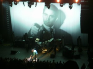 为 Morrissey暖场的乐队叫Doll and the Kicks,平心而论还不错,女歌手连蹦带跳唱得很卖劲,可是这时候大家都在排队买啤酒饮料,舞台上灯光非常简陋,后面一块大屏幕,看起来可以投影一场电影,果然暖场乐队散了之后,又放了半个小时音效奇差的恶俗怀旧音乐录像。当叽叽喳喳的观众们都开始有点儿不耐烦的时候,屏幕上突然换成了一个眼神锐利的头像(之后整场演唱会,后面的幕布上都打着这个头像),然后“When in this charming car,This charming man。。。” 坐在很靠后的我也跟大家一起站起来,仔细打量台上精神抖擞的Morrissey,蓝衬衫和肥大褪色的裤子,(后来看别人近距离拍的照片,才看到他真的快变成一个老头儿了)。据报道,上次演唱会他就是唱完这首歌才倒下的,这天晚上他明显心情和精神都好多了,唱完一曲,开始给大家讲自己早上在旅馆里看电视,翻了几十个频道,没有一个可看的节目。